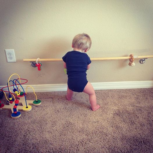 The (what I call) mini ballerina bar has been the utopian addition to the playroom. It encourages him to pull himself up from a seated position and walk himself along the bar. I attached a few toys to the bar to keep him entertained and intrigued, and my how it works!